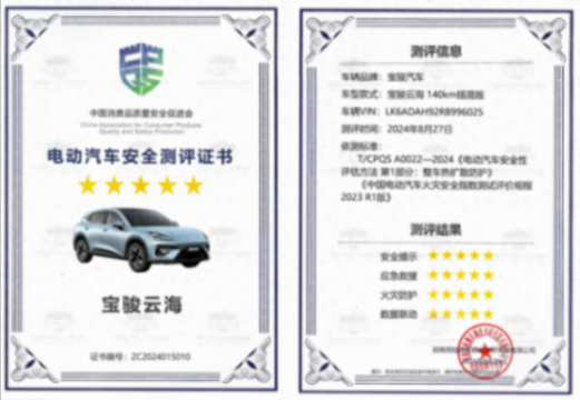 憑借著神煉電池以及自身安全系統的不俗表現,寶駿云海在電動汽車安全測評中,連續2次被針刺都展現出全程無熱擴散、無起火和無爆炸現象,最終獲得了中國電動汽車安全測評五星+認證。