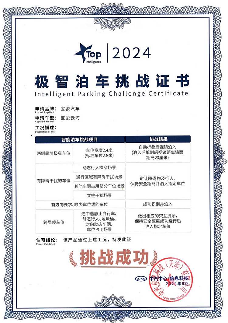 對于電池安全,當前新能源車企都比較重視,這點毋庸置疑,除此之外,寶駿云海作為15萬內為數不多具備高階智駕能力的新能源SUV。憑借它搭載的靈眸智駕具備的智能泊車,寶駿云海也獲得了中汽中心權威認證,獲得了“TOP Intelligence極智泊車挑戰”證書。