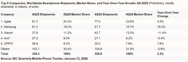1 月 14 日消息,IDC 今日(1 月 14 日)發(fā)布的《全球季度手機(jī)跟蹤報(bào)告》初步數(shù)據(jù)顯示,2025 年第四季度(4Q25)全球智能手機(jī)出貨量同比增長(zhǎng) 2.3%,達(dá)到 3.363 億部。盡管受到存儲(chǔ)芯片短缺的影響,市場(chǎng)仍在高端機(jī)型持續(xù)增長(zhǎng)、折疊屏強(qiáng)勁表現(xiàn)以及消費(fèi)者對(duì)未來漲價(jià)預(yù)期而提前換機(jī)的共同推動(dòng)下實(shí)現(xiàn)增長(zhǎng)。