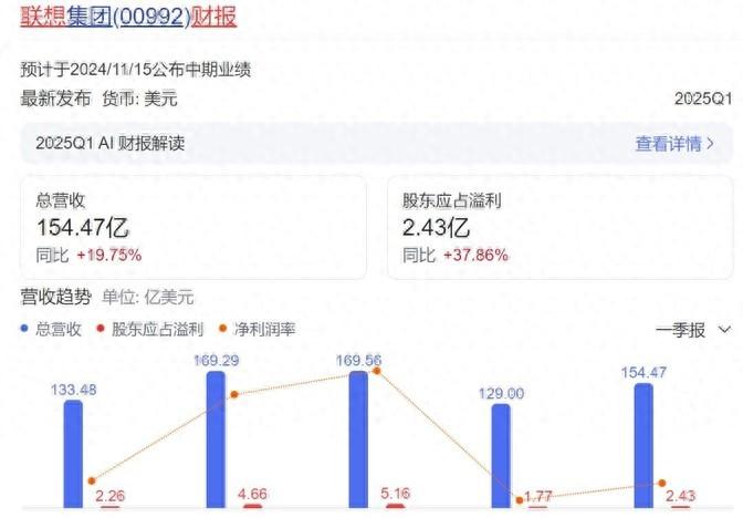 你看聯想這股價也是慘,2024年到現在也就漲了4.5%。PC市場這幾年確實不太好過,2023年全球PC出貨量才2.47億臺,創了17年新低。不過好消息是,市場已經開始回暖了,2025年第一季度聯想總算止住了頹勢,營收和凈利潤都實現了不錯的增長。