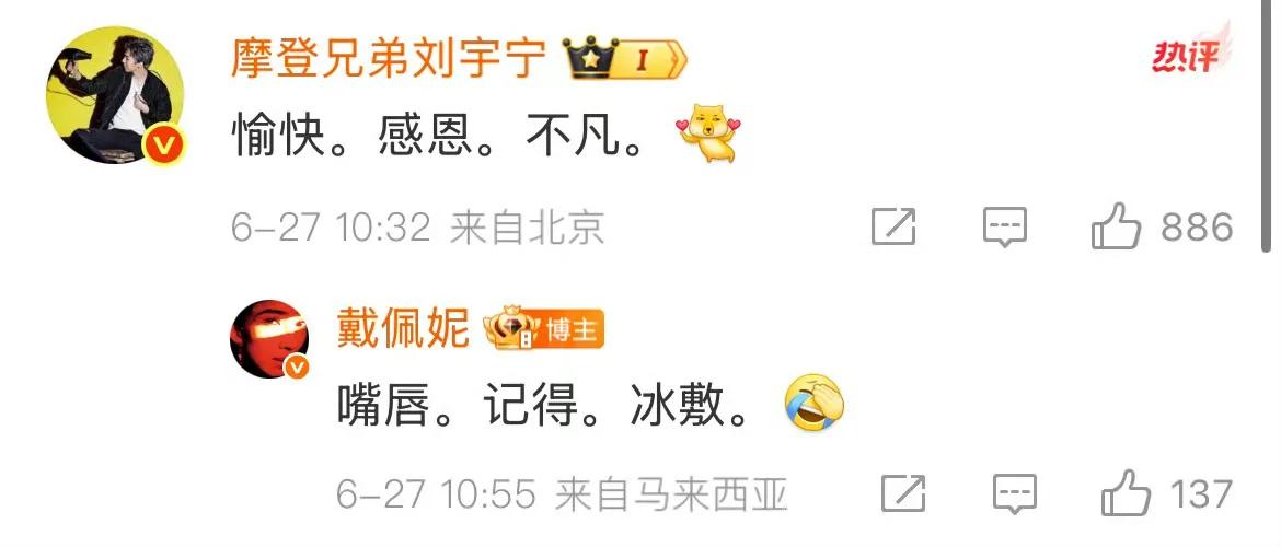 果然戴佩妮老師是知道怎么玩梗的,就連標(biāo)點(diǎn)符號(hào)都與劉宇寧發(fā)的那么對(duì)應(yīng)一致!看著姐姐“貼心”提示劉宇寧冰敷嘴唇,