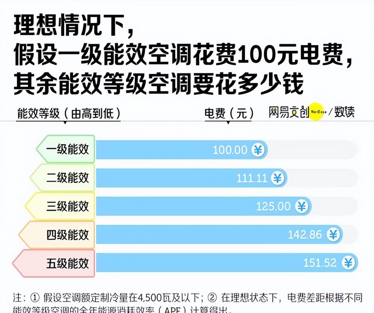算一下,同樣制冷,五級能效比一級能效多花一半多的電費(fèi)。