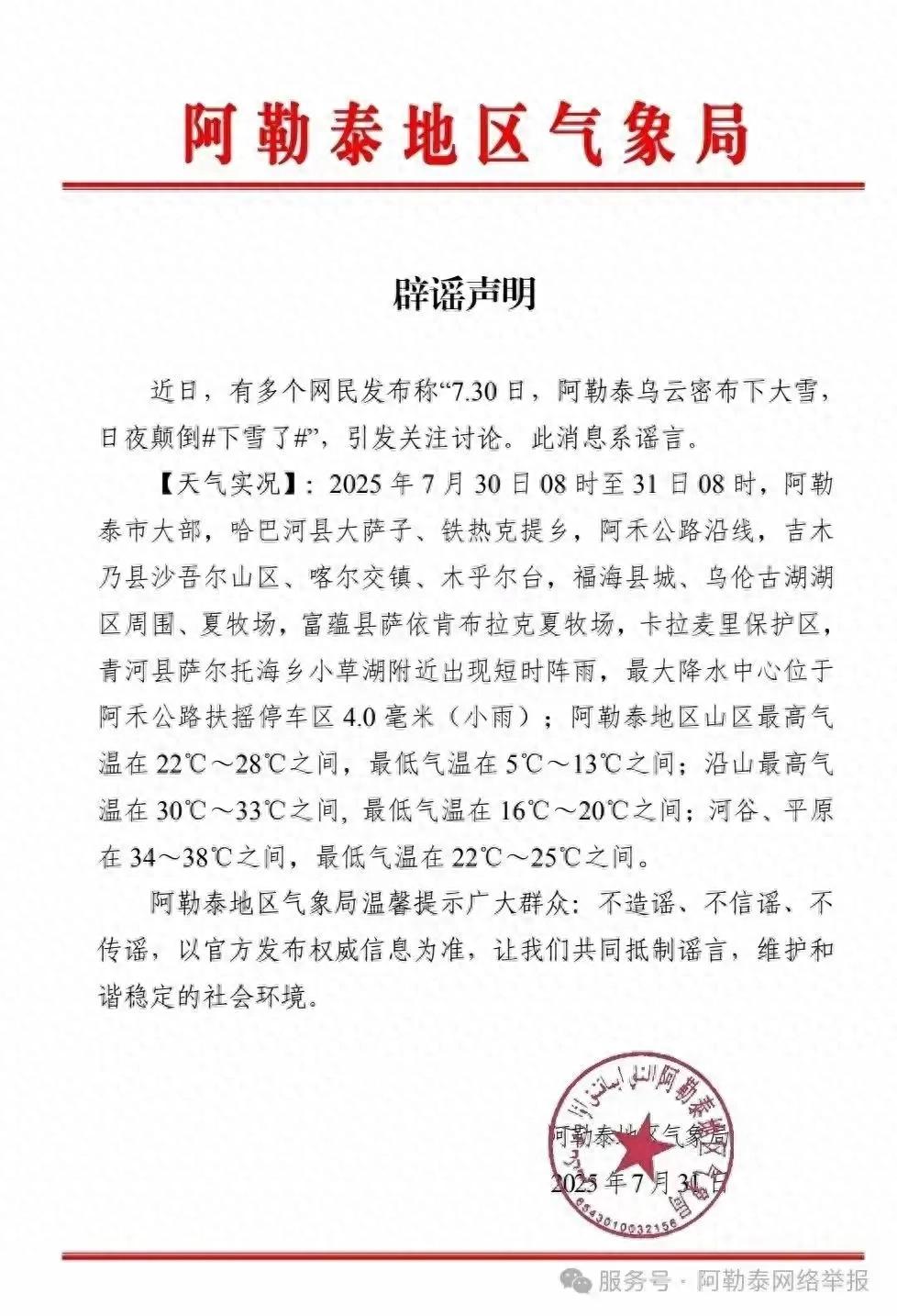 光明網(wǎng)報(bào)道,2025年7月31日,有網(wǎng)民在社交平臺(tái)發(fā)布“7月30日,阿勒泰烏云密布,下大雪,日夜顛倒”等內(nèi)容。經(jīng)氣象部門(mén)核實(shí),該信息屬不實(shí)信息。