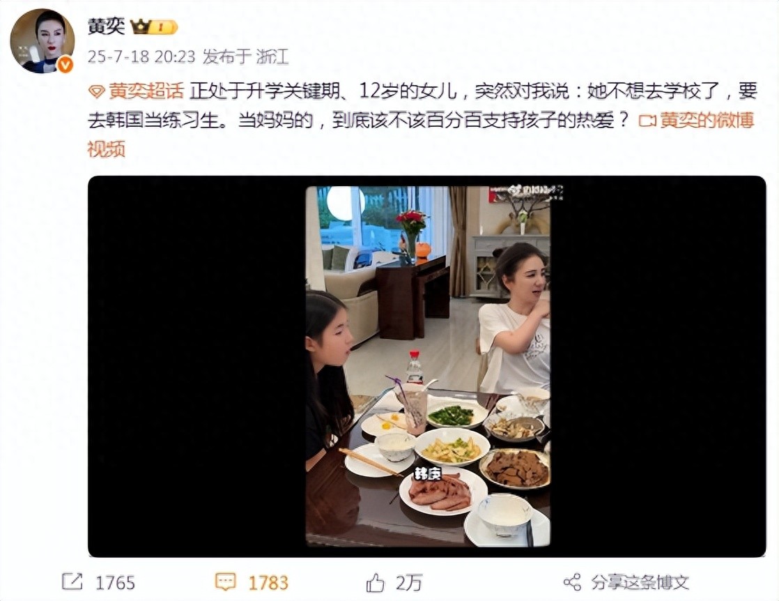在黃奕回應(yīng)網(wǎng)傳女兒出道傳聞之前,她曾發(fā)文透露12歲鐺鐺想去韓國當練習(xí)生,并且還不想去讀書了。當時黃奕的發(fā)文一出,就引起了不小的爭議,但都沒有則此的質(zhì)疑聲大。