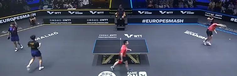 第四局,6/11,開局2:2平后,對方推挑得分,比分來到2:3,然后就一直處于落后狀態(tài),最后在多扳快速對拉后6:11結(jié)束了這局比賽。這樣,大比分2:2平。