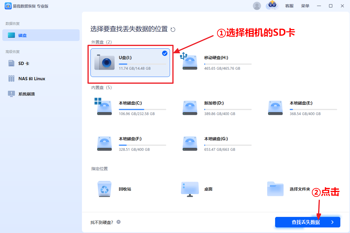 使用讀卡器將SD卡與電腦成功連接,確保電腦能夠識(shí)別SD卡。然后運(yùn)行易我數(shù)據(jù)恢復(fù)軟件,在軟件主界面中,您會(huì)看到左側(cè)列出了各種存儲(chǔ)設(shè)備,包括硬盤、U盤以及連接的SD卡等。在這些設(shè)備中,找到并選中您需要恢復(fù)數(shù)據(jù)的SD卡,接著點(diǎn)擊界面上的“查找丟失數(shù)據(jù)”按鈕,軟件隨即開始對(duì)SD卡進(jìn)行全面掃描,尋找丟失的數(shù)據(jù)。