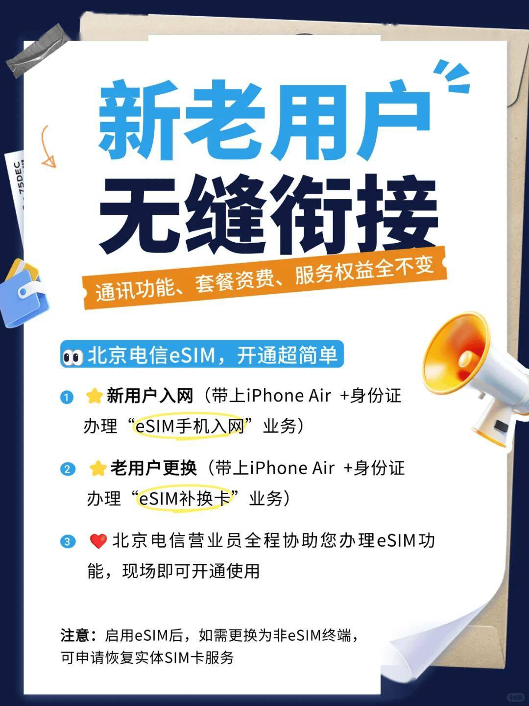 - 新用戶入網:帶上 iPhone Air + 身份證,辦理“eSIM 手機入網”業務