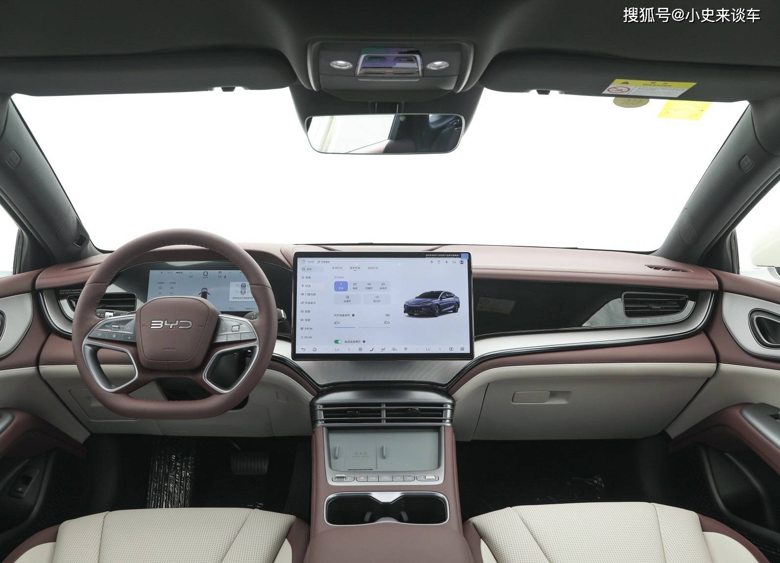 進入車內,內飾采用環抱式海浪中控臺設計,15.6英寸2.5K自適應旋轉屏搭載DiLink 100系統,內置比亞迪D100芯片與DeepSeek大模型,支持毫秒級語音響應與全場景連續對話。中控臺取消物理按鍵,通過觸覺反饋技術模擬實體按鍵操作,配合10.25英寸全液晶儀表與HUD抬頭顯示,構成三維交互界面。懷擋設計釋放出中控臺下方的50L多功能儲物空間,內置-6℃~55℃智能冷暖冰箱,可容納12罐標準飲料。座椅采用Nappa真皮與麂皮混搭材質,前排配備16向電動調節、加熱/通風/按摩功能,后排座椅支持27°-32°多角度電動調節。門板內襯采用超纖絨材質,搭配真鋁飾條與64色氛圍燈,營造出深海艙般的沉浸體驗。