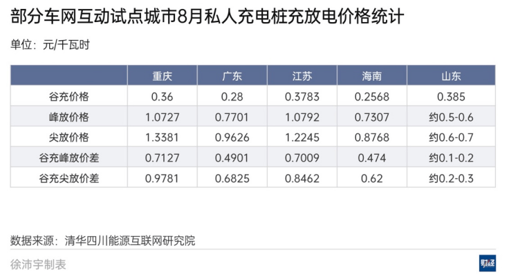2025年4月國家發展改革委等四部門發布《關于公布首批車網互動規模化應用試點的通知》(下稱“首批試點通知”)后,各地陸續發布相關配套支持政策。其中,擴大峰谷電價差是基石性的支持政策;目前,重慶、山東、廣東、江蘇、安徽、海南等省市針對V2G試點已出臺了專項上網電價試點政策,充放電價差最高接近1元/度。