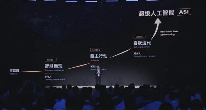 「實(shí)現(xiàn) AGI(通用人工智能)已是確定性事件,但這只是起點(diǎn)。AI 不會(huì)止步于 AGI,它將邁向超越人類智能、能夠自我迭代進(jìn)化的超級人工智能(ASI)。」吳泳銘在演講中開宗明義,并首次系統(tǒng)性地闡述了阿里眼中通往 ASI 的演進(jìn)路線圖,這條路分為三個(gè)清晰的階段,構(gòu)成了一套完整的「三級跳」理論。