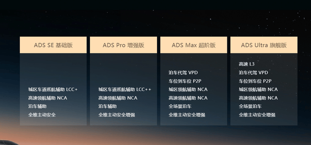 第二是輔助駕駛層面,由華為自研的激光雷達、車機芯片應該是9610系列、輔助駕駛芯應該是MDC610,整套軟硬件結合是華為的優(yōu)勢,從目前的輔助駕駛能力看,華為賦能的車型有三種模式,ADS SE 無激光雷達版本主視覺方案,增強版,這個增強版應該就是5000元開通的功率等可以啟停,但是不能轉彎的模式,Max版本應該就是目前問界M7/8以及智界R7、深藍S09、傳祺向往S9、阿維塔07/06/11/12上的,而旗艦版,應該是問界M9和尊界乃至享界上的四激光雷達版本的。