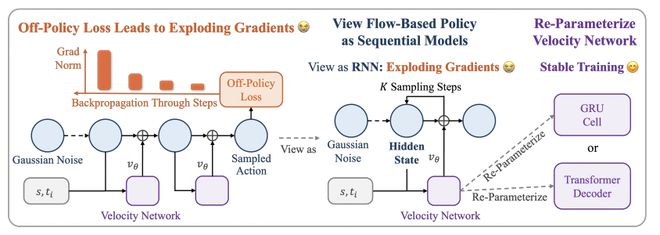 不少已有的類似工作都選擇繞開了這個問題:要么用替代目標避免對流策略多步采樣的過程求梯度 (如 FlowRL [3]),要么把流匹配模型蒸餾成單步模型,再用標準 off-policy 目標訓練 (如 QC-FQL [4])。這樣做是穩定了訓練,但也拋棄了原本表達更強的流策略本體,并沒有真正在訓練一個流策略。而我們的思路是:發現流策略多部采樣本質就是 sequential model ,進而用先進的 sequential model 結構來穩住訓練,直接在 off-policy 框架內端到端優化真實的流策略。