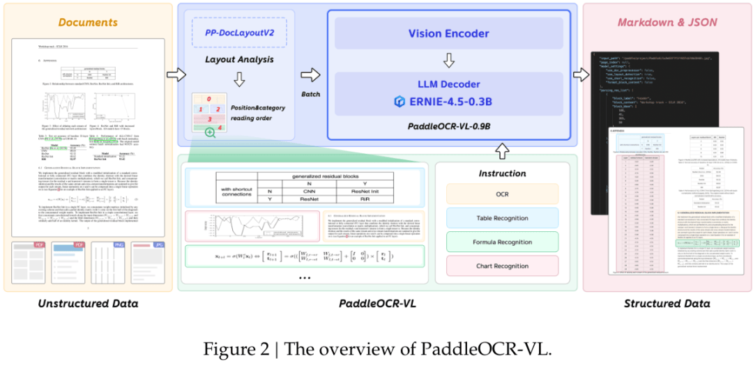 模型能做到又小又強(qiáng),關(guān)鍵在于它的設(shè)計(jì)思路。PaddleOCR-VL沒(méi)有選擇做一個(gè)大而全的端到端模型,把一張文檔圖片直接扔進(jìn)去,讓模型自己搞定所有事。