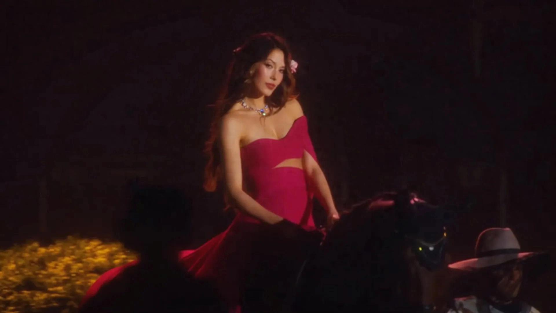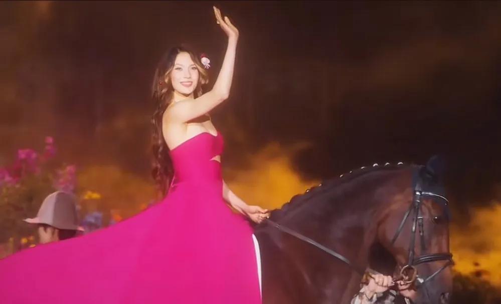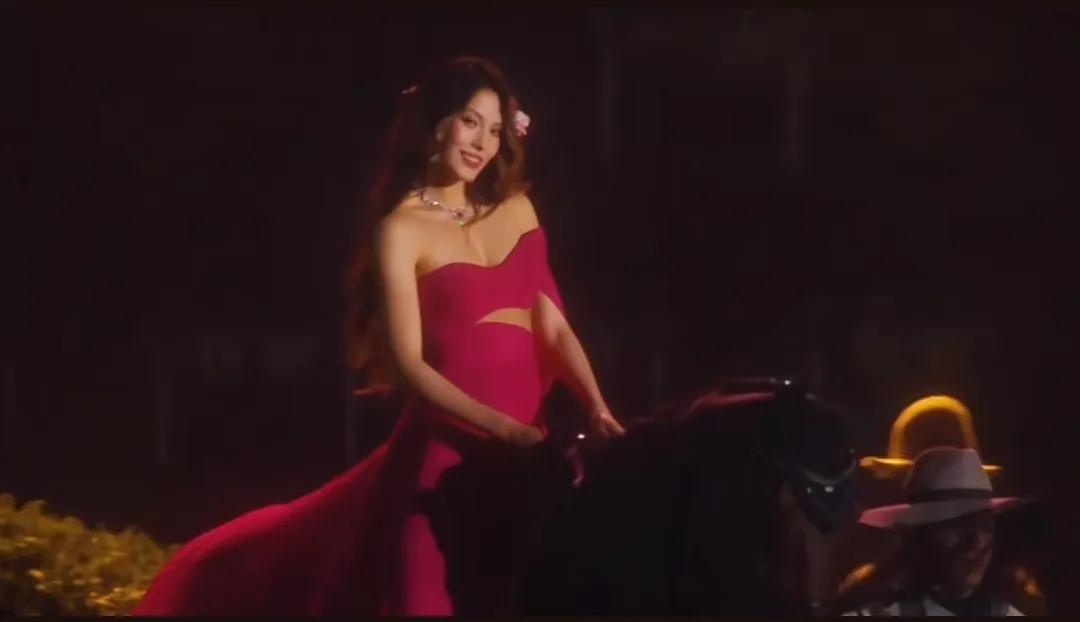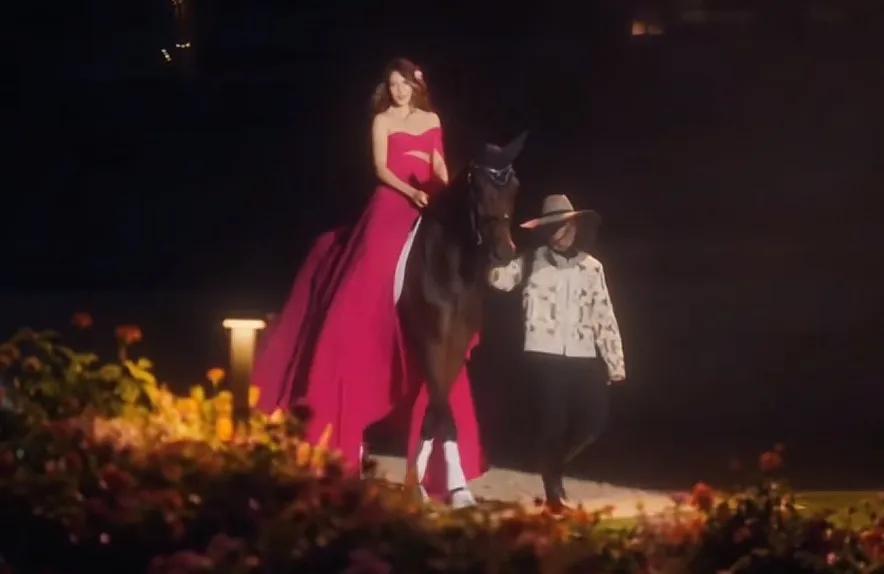 在紅毯入口處,谷愛(ài)凌以一身正紅色長(zhǎng)裙與冷峻馬背形成強(qiáng)烈視覺(jué)對(duì)比,單手控韁從容前行。臨近主鏡頭時(shí),她自然地拋出一個(gè)俏皮的wink,這一瞬間被攝影師精準(zhǔn)捕捉。