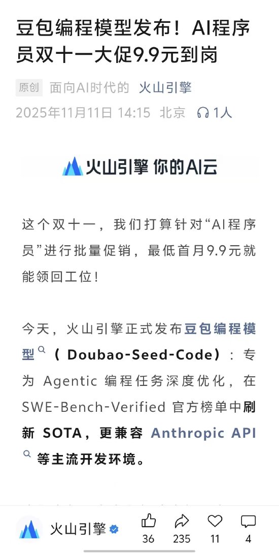 同時,此次發布的編程模型價格進一步降低。官方表示,豆包編程模型綜合使用成本相比業界平均水平降低62.7%,國內最低價。目前,該模型已通過火山方舟平臺全量開放 API。面向開發需求量大的個人開發者,并且公布訂閱制套餐包“Coding Plan”,“用得多省得多,首月低至9.9元。”官方提到。