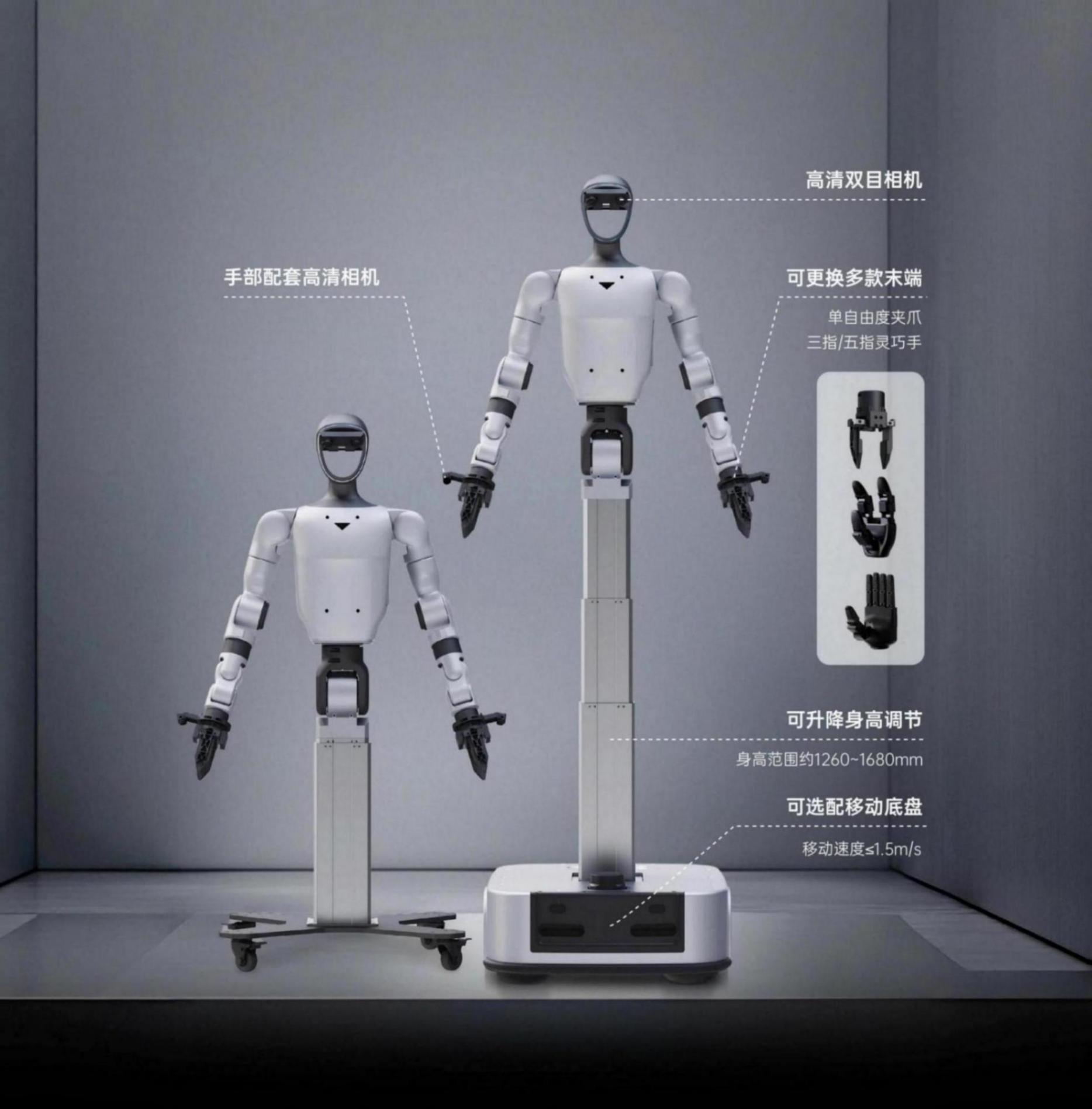 G1-D 機(jī)器人身高約 1260-1680mm(立柱高度可調(diào)整),其最大特點(diǎn)是頭部和手部均配備了高清相機(jī),實(shí)現(xiàn)了獨(dú)特的“手眼”協(xié)同觀測(cè)。該機(jī)器人分為通用版和旗艦版,整機(jī)自由度分別為 17 和 19 個(gè),單臂最大負(fù)載約 3kg。它采用輪式與升降相結(jié)合的移動(dòng)升降設(shè)計(jì),垂直作業(yè)范圍可達(dá) 2 米,腰關(guān)節(jié)運(yùn)動(dòng)空間為 Z±155°、Y -2.5°~+135°。